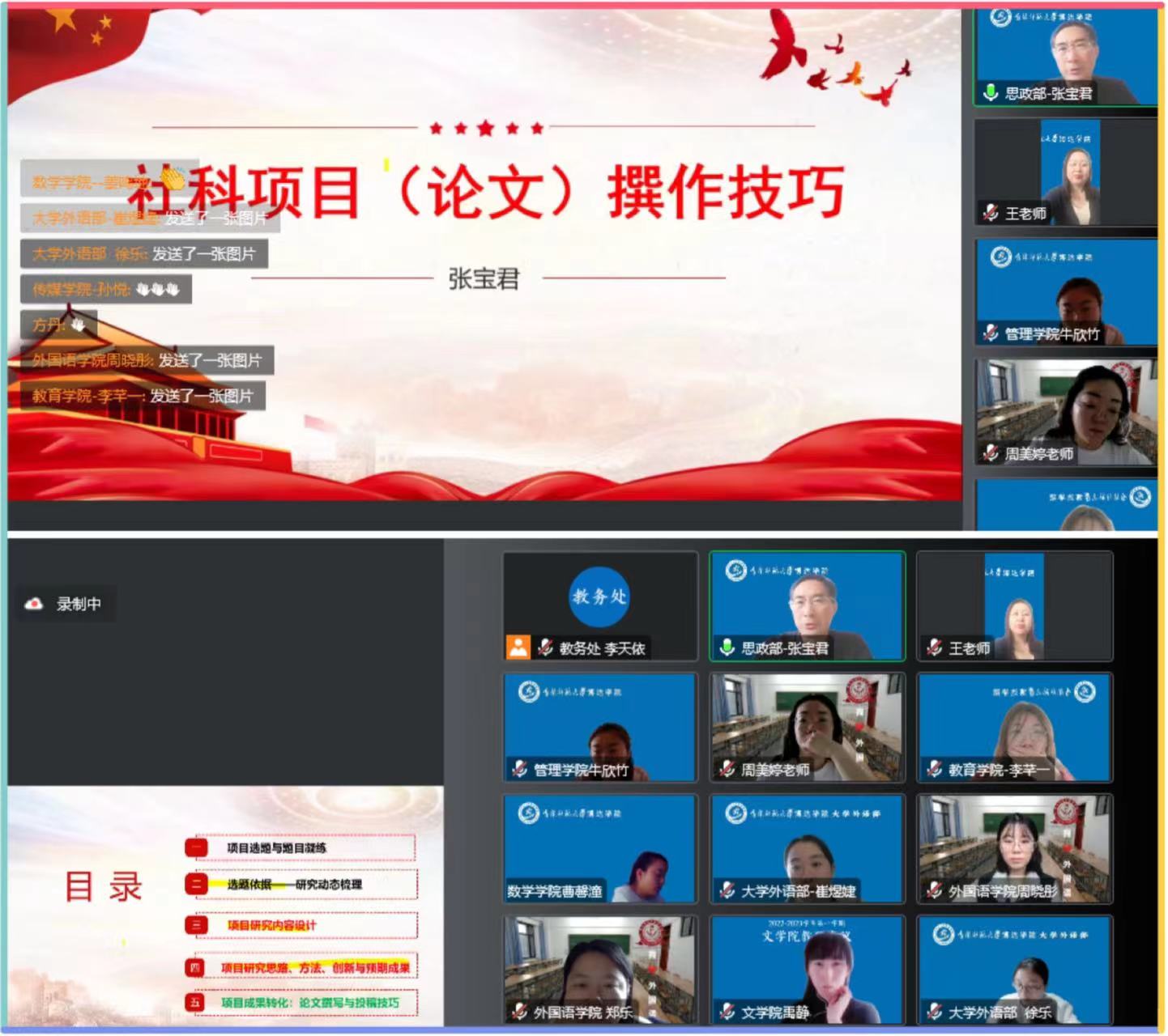 为提升新入职教师教科研水平,通过教科研提高教学质量,促进学生的全面发展,教师教学发展中心于10月21日下午,邀请思政部张宝君主任在线为新入职教师进行“社科项目(论文)撰写技巧”专题讲座。