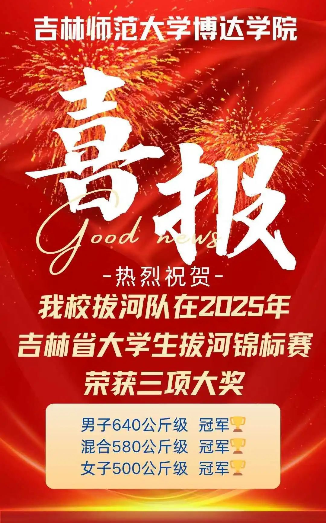 由吉林省学生体育协会主办的2025年吉林省大学生拔河锦标赛于5月11日在长春工业大学(南湖校区)体育馆举办。星空游戏中心入口体育学院拔河队在多支队伍中脱颖而出,分别获得高校混合组冠军、高校男子组冠军、高校女子组冠军的优异成绩。由体育学院院长陈立春担任领队,罗文涛老师、邹立昌老师、温振迪老师三名教练带领20名运动员参加本次比赛,荣获三金的优异成绩!