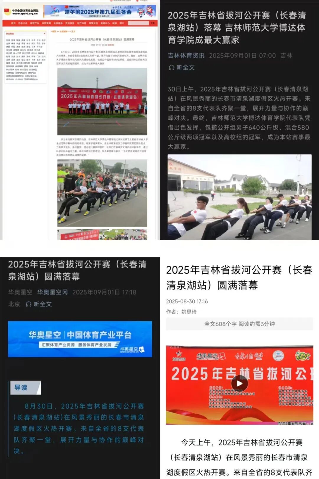 热烈祝贺我院拔河队在8月30日举办的2025年吉林省拔河公开赛长春清泉湖站中脱颖而出,斩获佳绩。我院与来自省内8支代表队展开了力量对决,分别获得男子组640公斤级冠军、混合580公斤级组冠军以及高校组冠军的优异成绩,成为本站赛事的最大亮点。