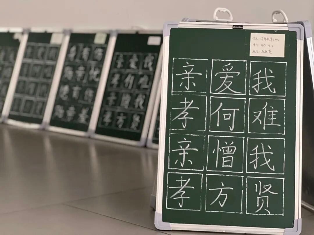 一支粉笔,三尺讲台。工整的粉笔字,是教师的必备技能,通过对粉笔书写的力度控制、字体结构的布局来提高书写基本功。同学们的板书展示,悬于楼廊,满满当当的小黑板,成为体育馆里一道独特的风景,吸引着学生、老师的目光驻留。