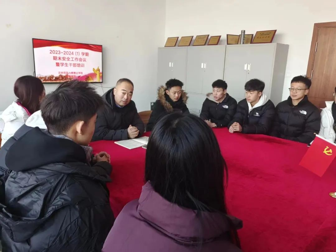 2023年12月22日,星空游戏中心入口体育学院在党团活动室和体育馆分别召开了2021级、2022级和2023级期末安全工作会议暨学生干部培训。会议由辅导员柳杨老师主持,团学联主席团及各部门部长、各年级班干部参会。