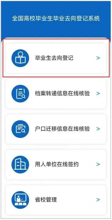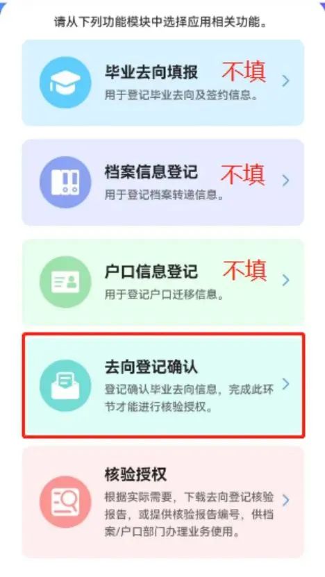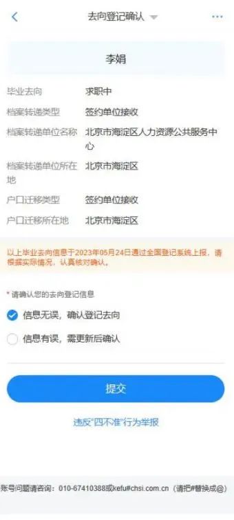 毕业生核对确认本人毕业去向、档案转递、户口迁移等信息是否正确。若信息无误,选择“信息无误,确认登记去向”。