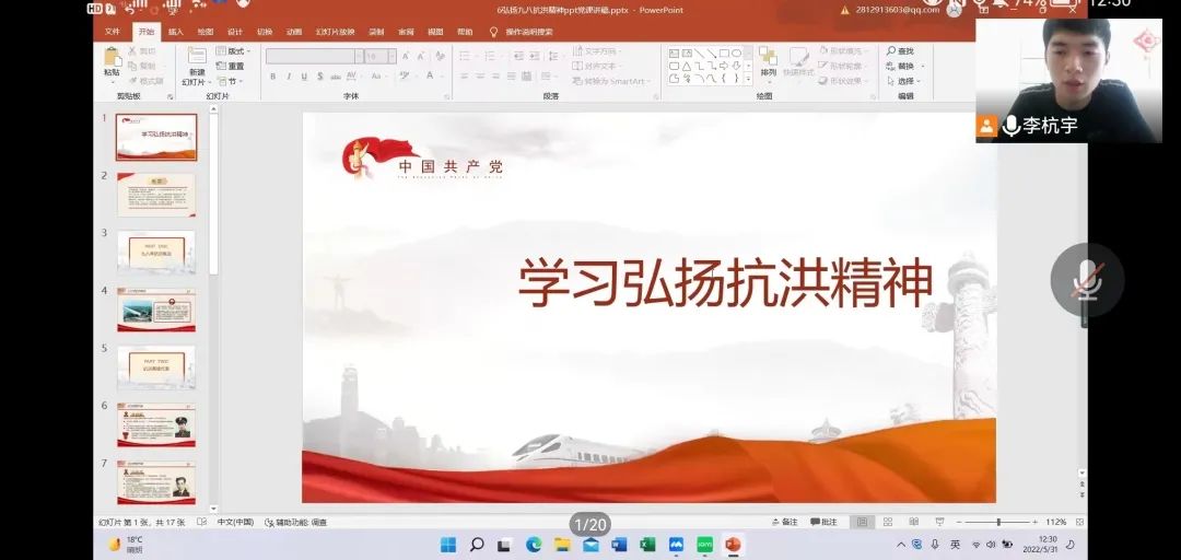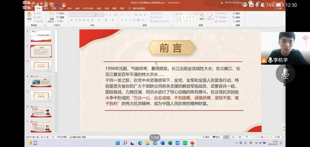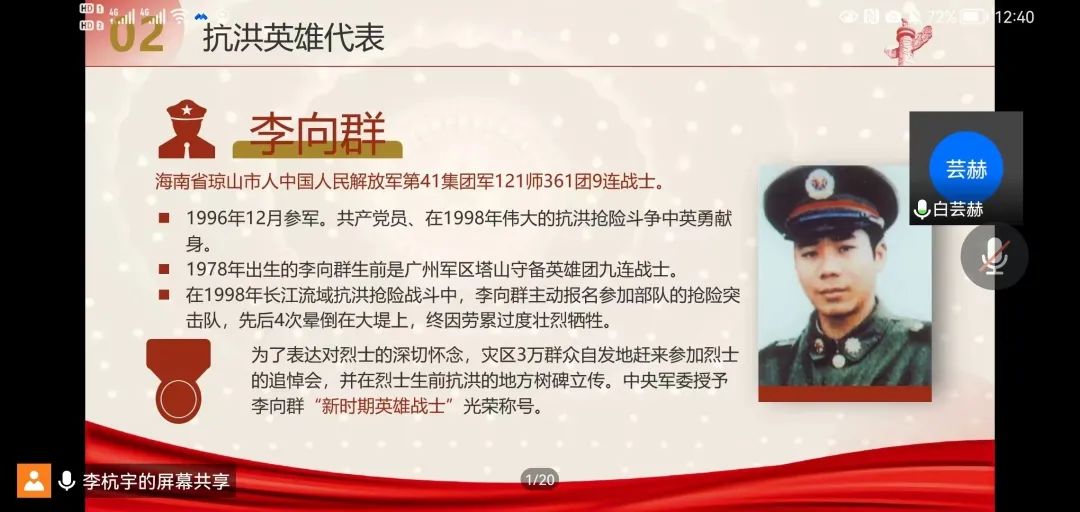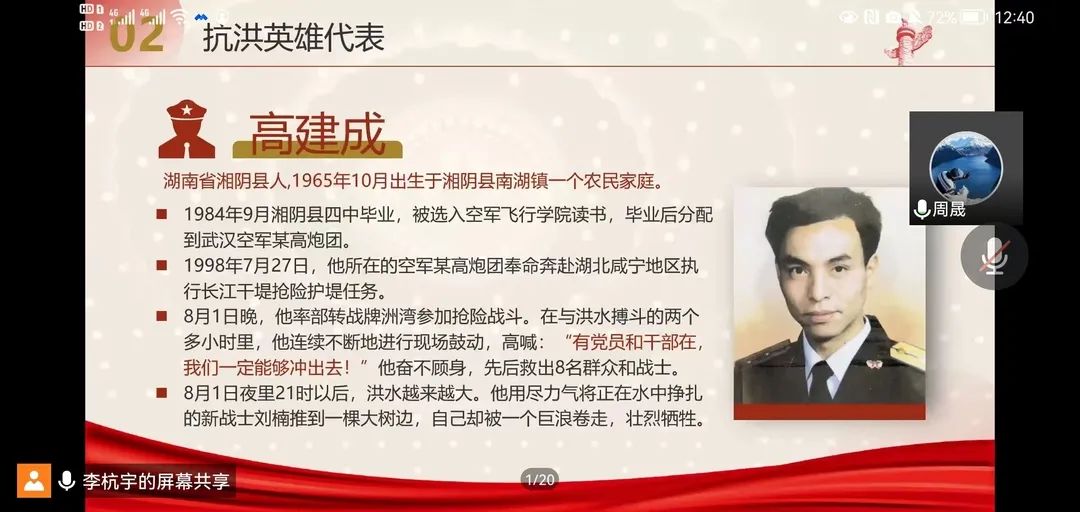 本期党课主题为—抗洪精神,由李杭宇同志为全体党员和积极分子解读抗洪精神内涵。