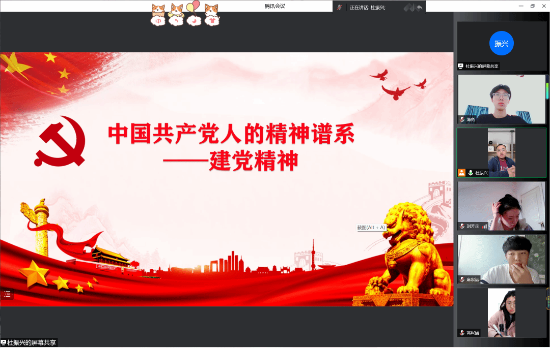 杜振兴老师分别从坚持真理、坚守理想;践行初心、 担当使命;不怕牺牲、英勇斗争;对党忠诚、不负人民伟大建党精神的四个方面为党员们解读中国共产党建党精神的丰富内涵。