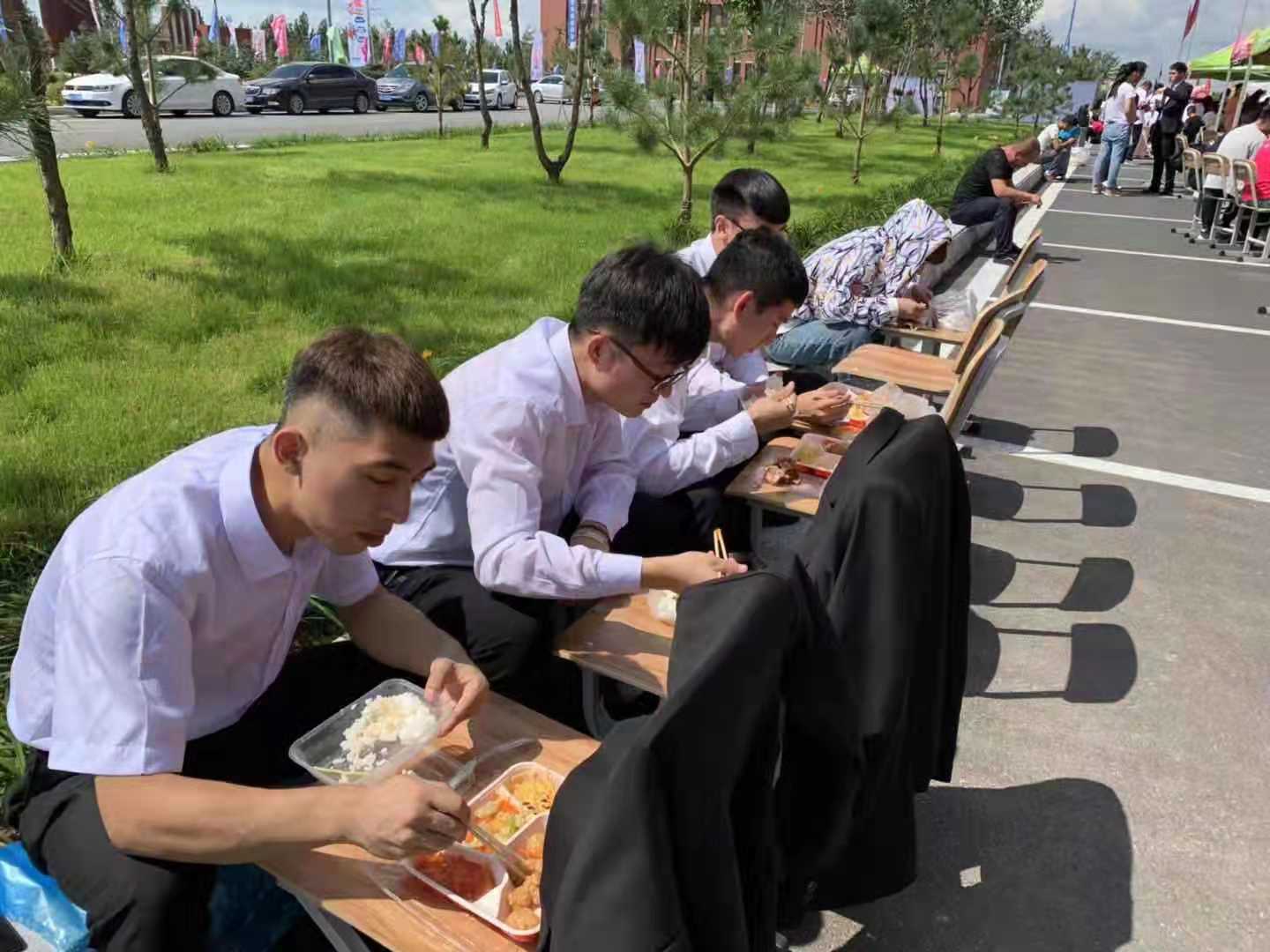 经过一上午的忙碌工作,迎新的工作人员早已经饥肠辘辘。这时,负责取餐的同学带来了热乎乎的午饭,大家完成手头上的工作后开始今天的午饭。偶尔有新生报道,迎新的工作人员立马放下手中的午餐开始热情详细的讲解并且陪同新生一起报道。学生会学长学姐们热情周到的服务很快消除了新生们初来乍到的陌生感。
