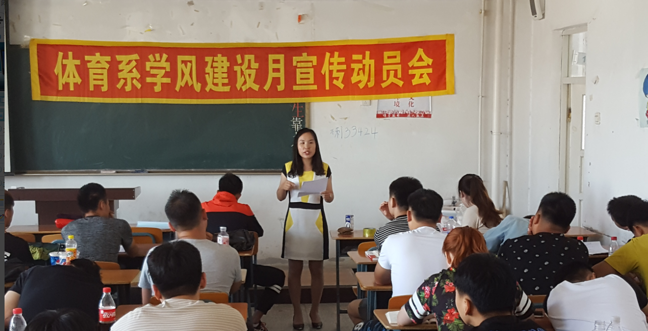 学风是学生思想道德品质、学习精神与综合素质的重要体现,是学生成长的基础和前提,是凝聚在教与学过程中的精神动力、态度作风、方法措施,也是学生健康成长的基石。2017年6月14日,体育系在1417教室召开了“体育系学风建设月宣传动员会”,出席本次大会的有体育系辅导员尹茹老师、以及15级全体同学。