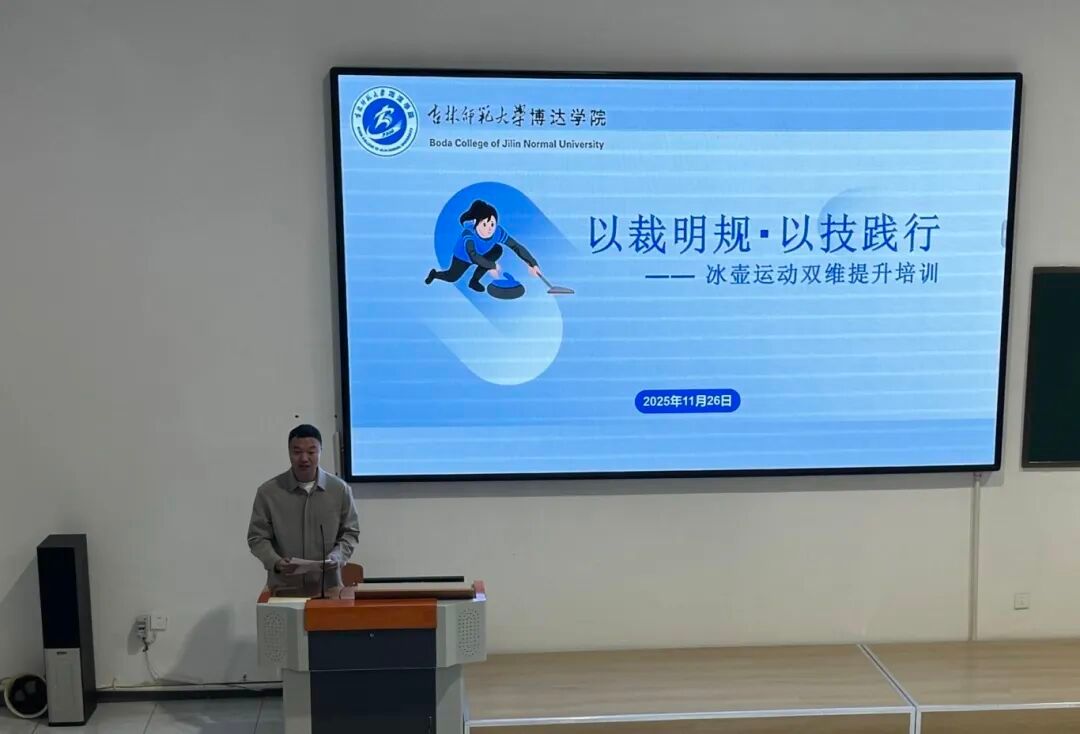 11月26日下午13:00,体育学院“以裁明规・以技践行”冰壶运动双维提升培训活动在体育馆阶梯5教室成功举办。本次培训体育学院有幸邀请到冰壶国家级裁判员尚游老师、省体育局体育运动学校冰壶教练员黄世豪老师,体育学院院长陈立春、副院长李重言、全体教师以及冰雪运动微专业学生共同参与了本次培训,本次培训活动由李重言副院长主持。