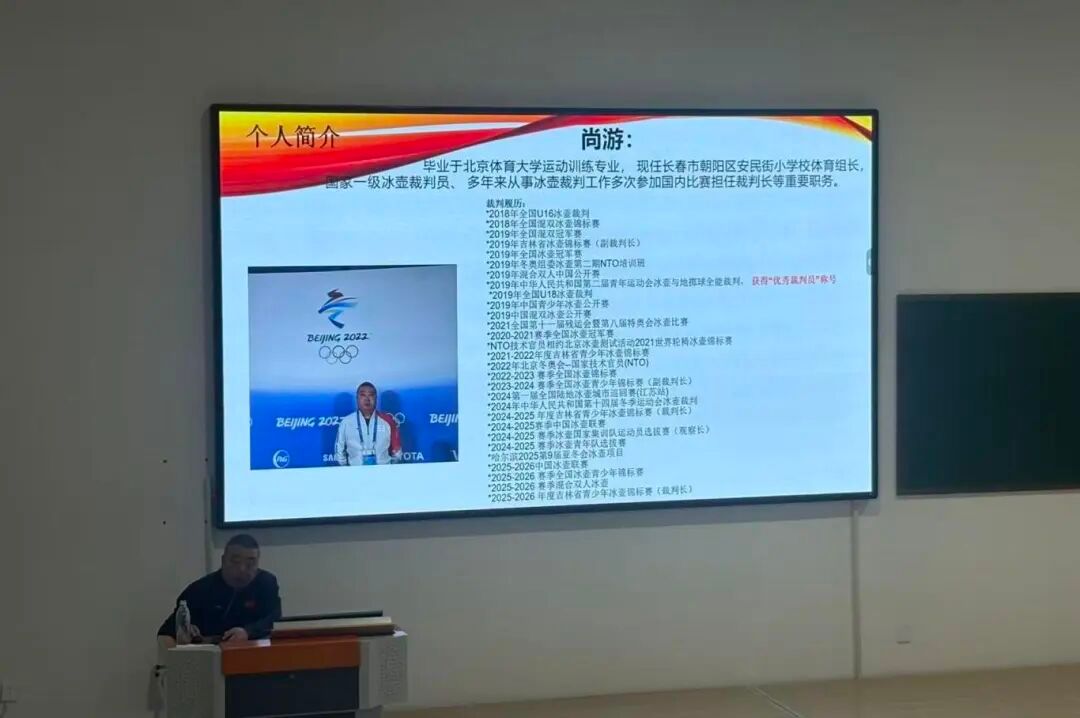 在裁判理论培训环节,冰壶国家级裁判员尚游老师以其丰富的赛事执裁经验,展开了系统讲解。尚老师结合实战案例,从规则解读、执裁流程到判罚要点,层层深入地搭建起冰壶运动的“规则框架”,让在场师生对裁判工作的专业性与严谨性有了深刻认知。