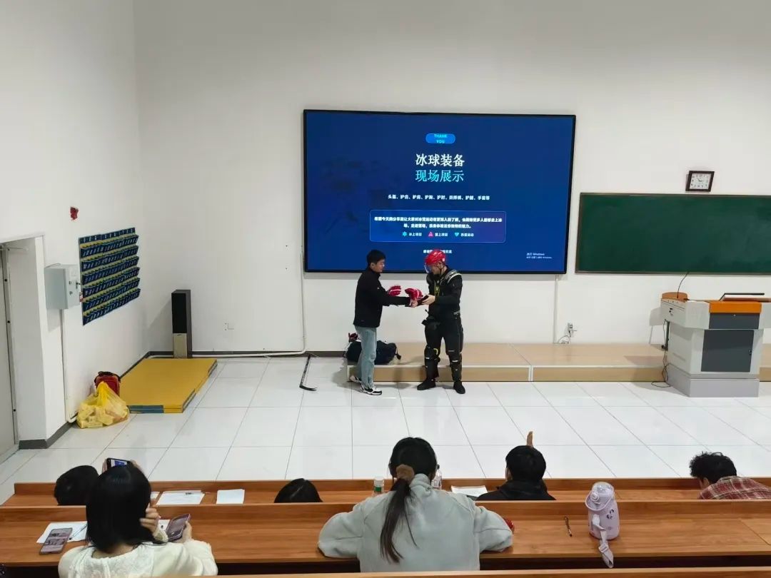 焦博彭围绕“冰雪运动项目介绍与装备规范”进行专题分享。他首先梳理了当前高校冰雪运动课程的主要方向,涵盖滑冰、滑雪、冰壶及冰球等项目,重点分析了不同项目在技术入门、体能训练与安全防护上的教学差异。随后,焦教师结合实物与图示,系统讲解了冰雪运动通用防护装备的穿戴规范,包括头盔、护膝、护肘、手套及对应项目的专项护具,并强调了“装备适配”与“动作规范”双线并行的教学原则。