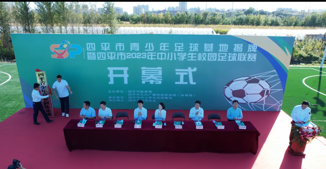 首先由四平市人民政府副市长王昊昱宣布四平市2023年中小学生校园足球联赛开幕,并为高中组比赛开球。开幕式现场,何旭明、唐彬蔚为四平市青少年足球训练基地揭牌,我院学生代表陈宇进行宣誓。