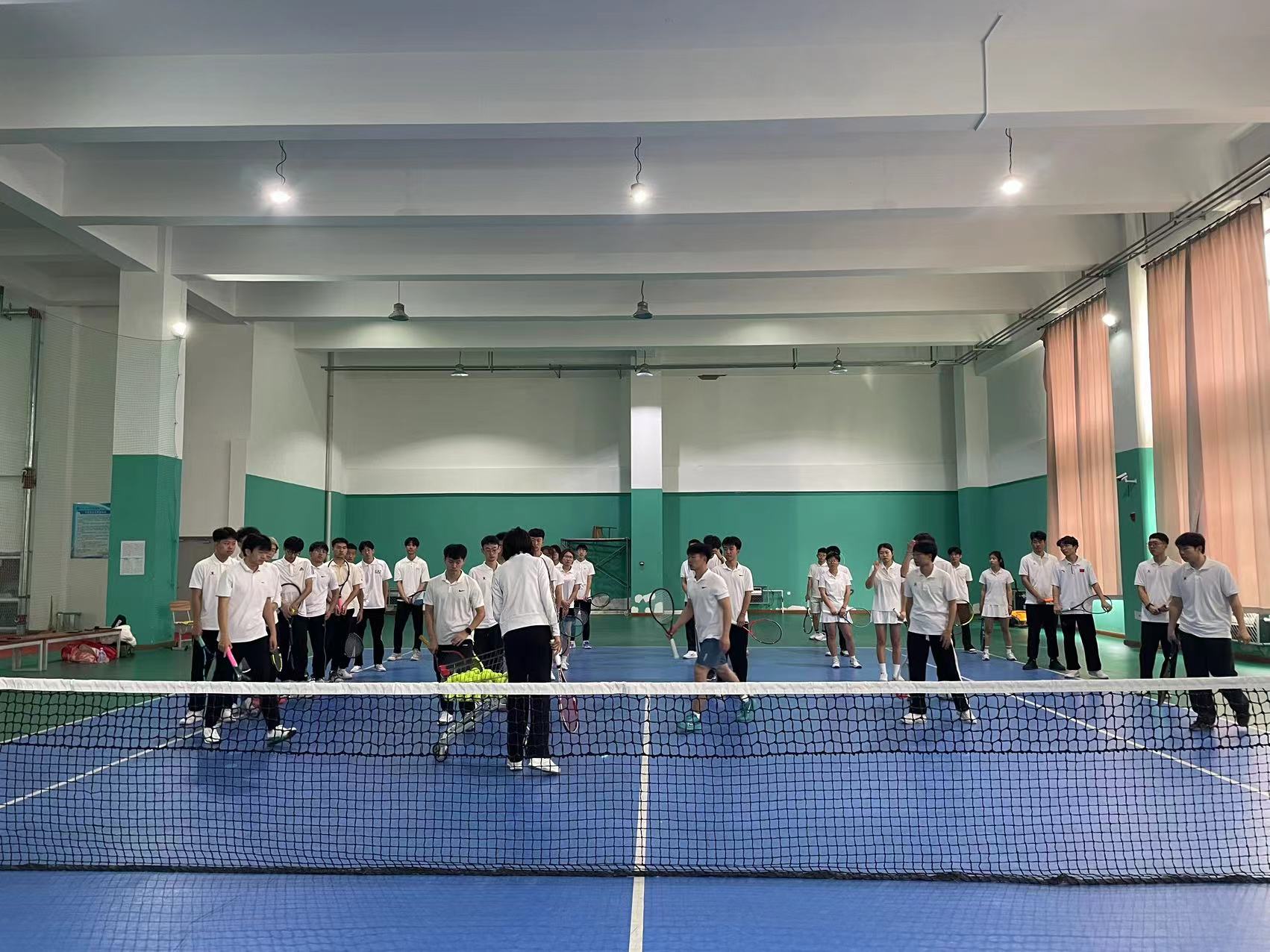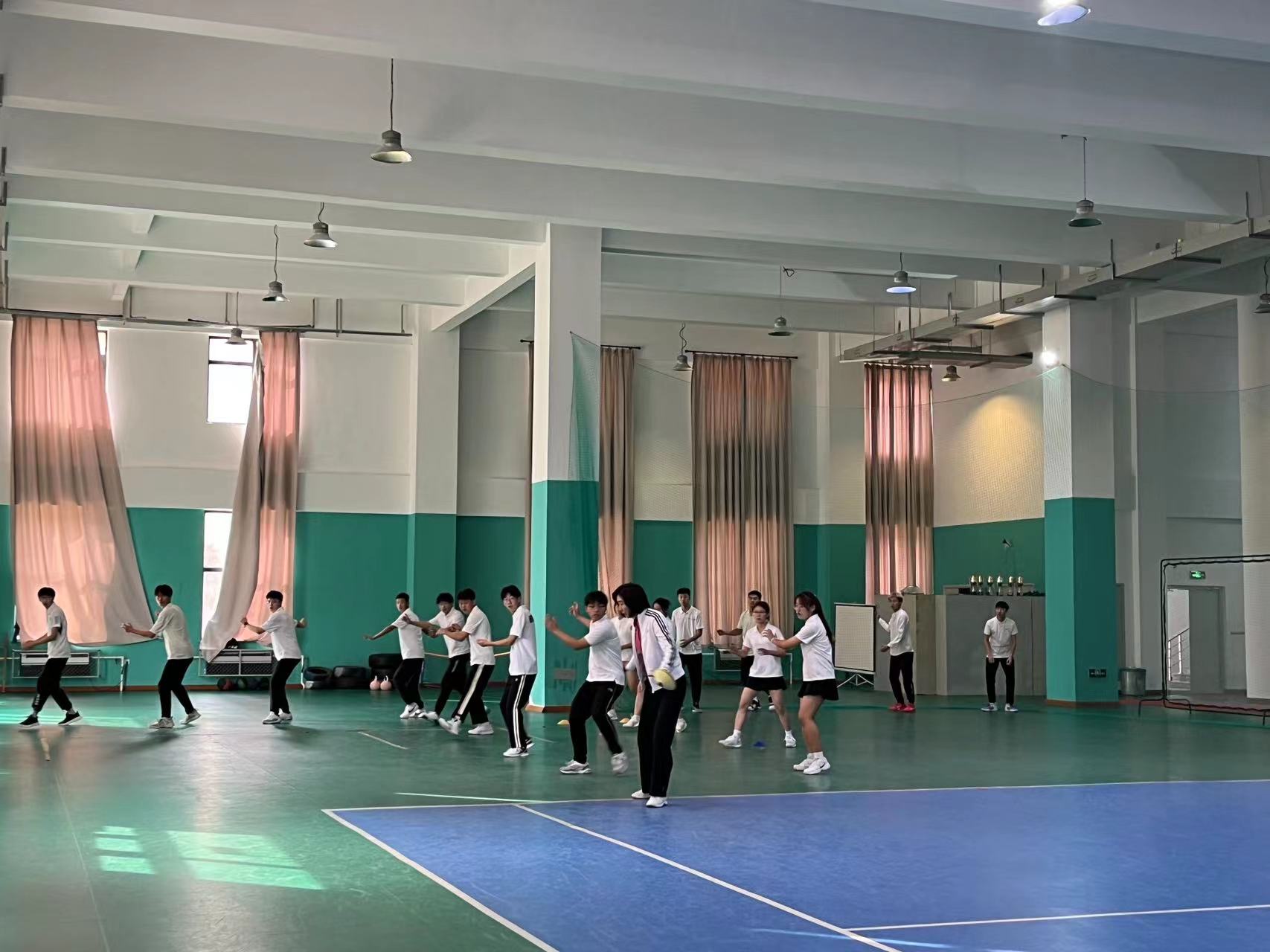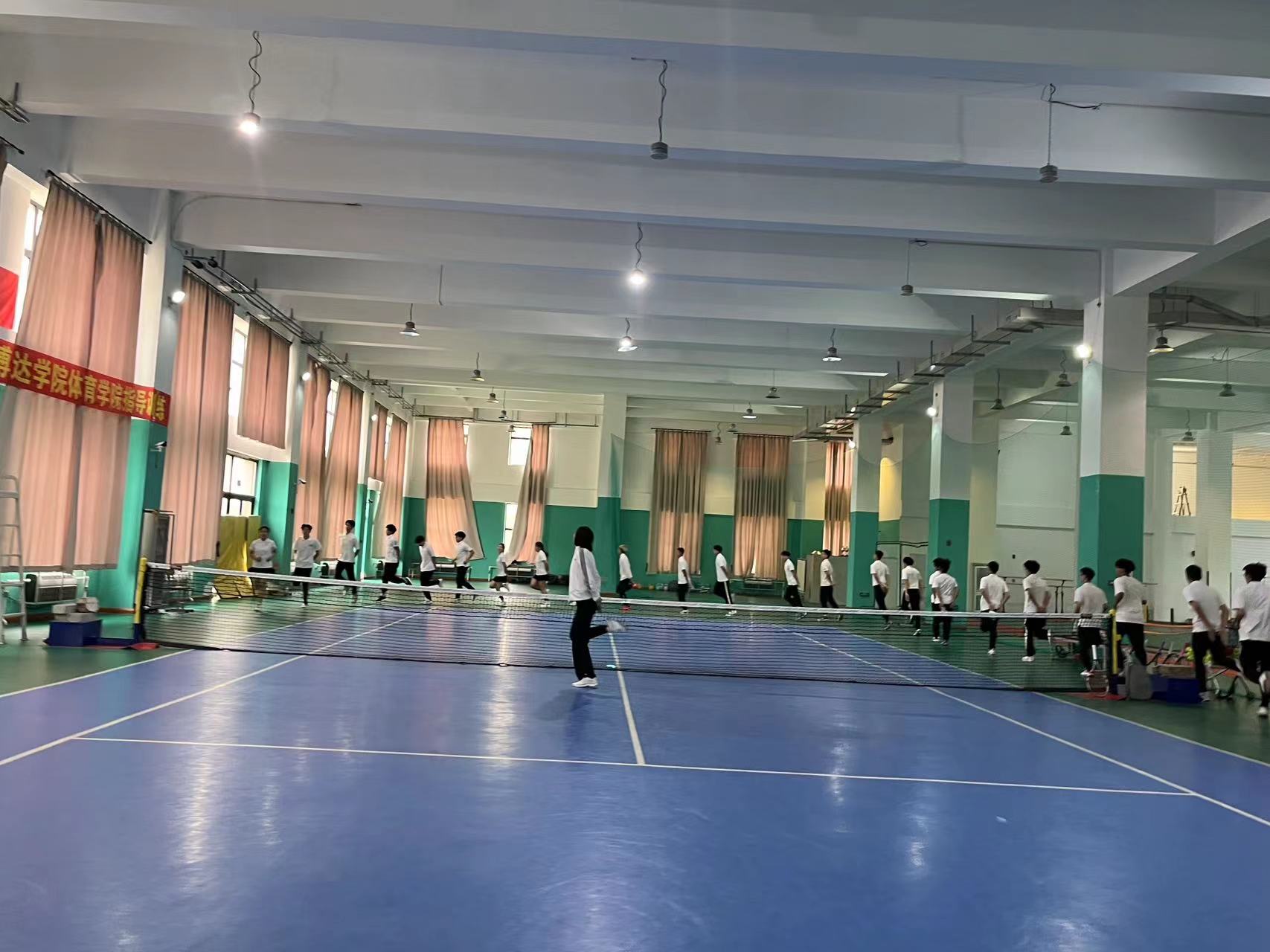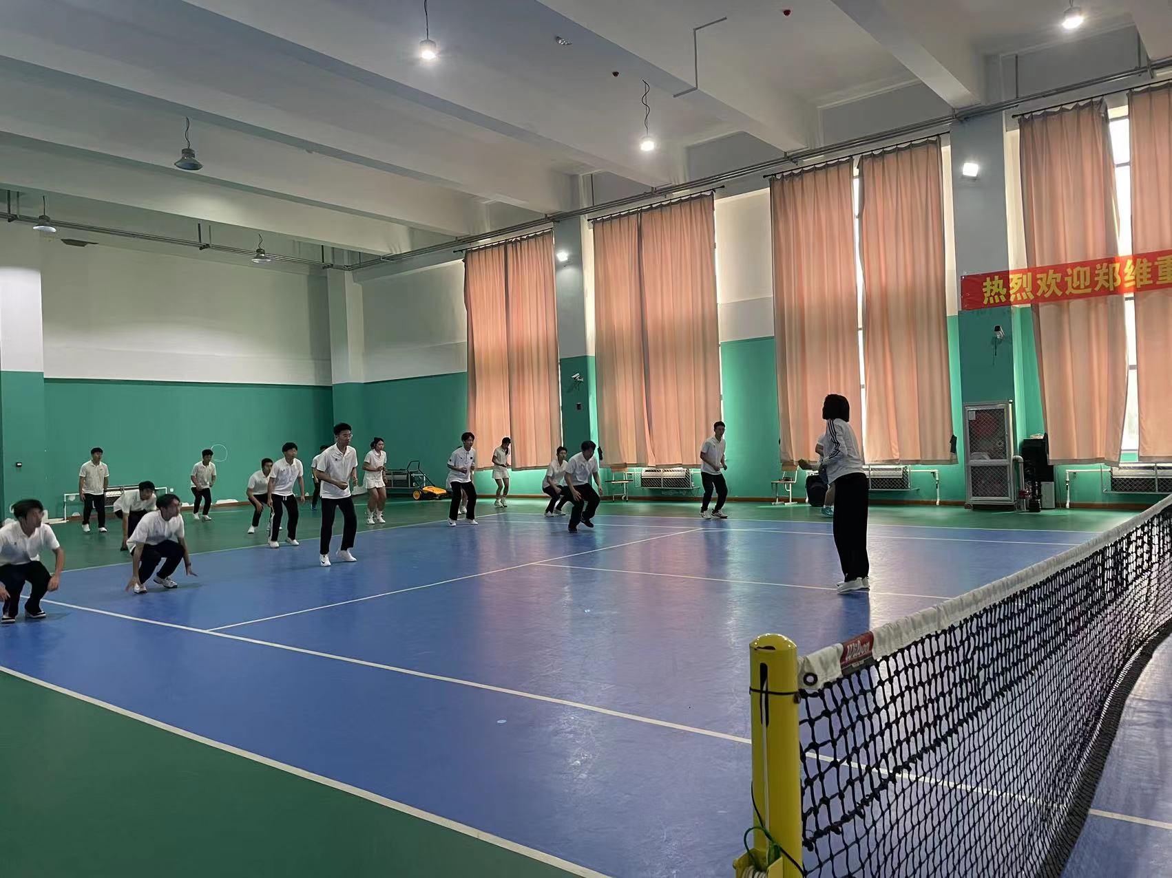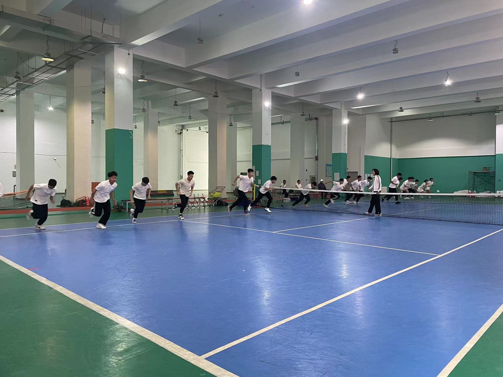 首先,在郑维重教练的组织带领下同学们先进行热身运动,围绕网球馆慢跑、高抬腿,后踢跑等,以及同学们在郑维重教练的指导下分组练习了网球的基本步伐。