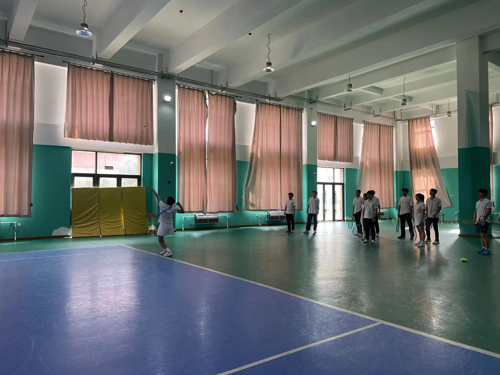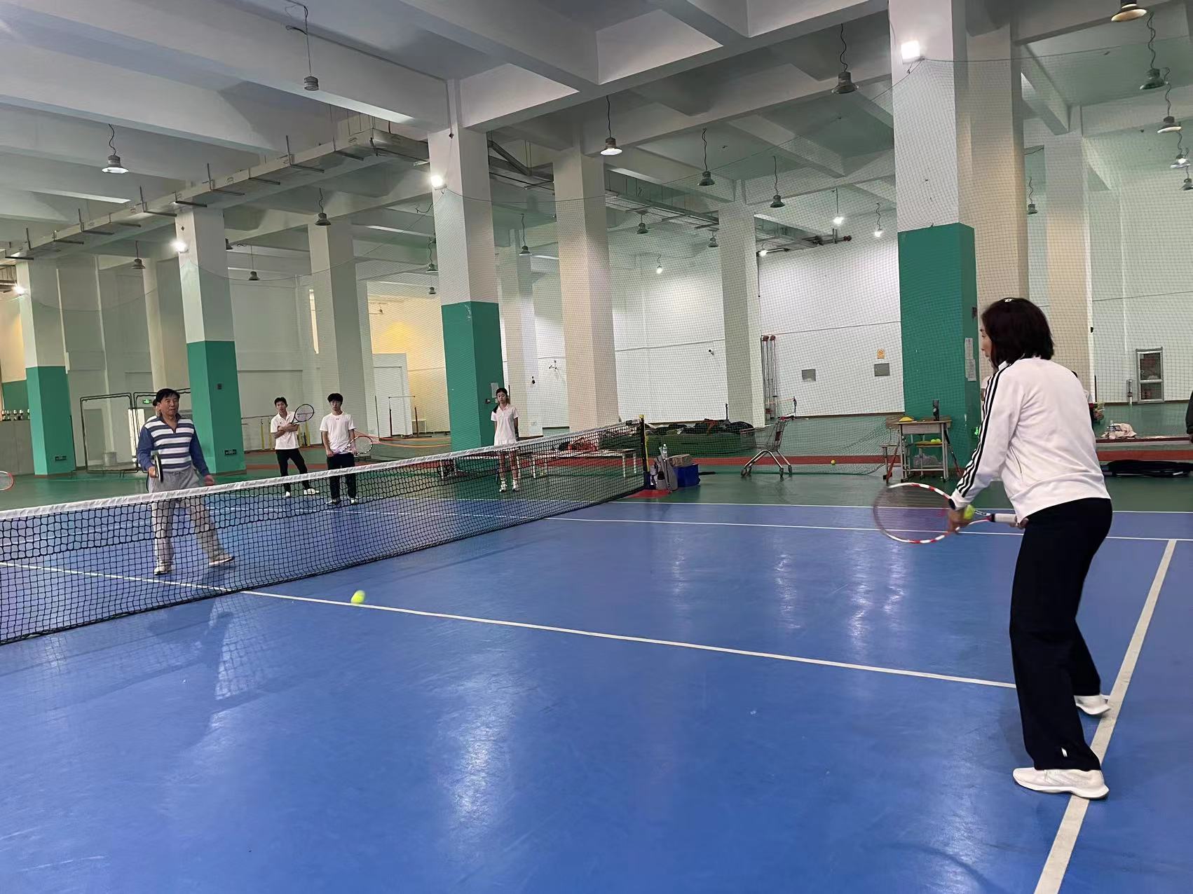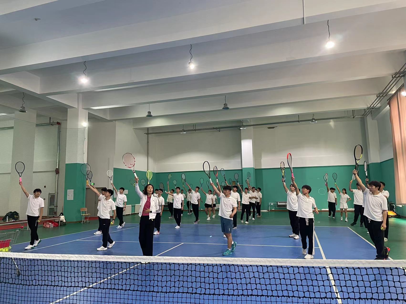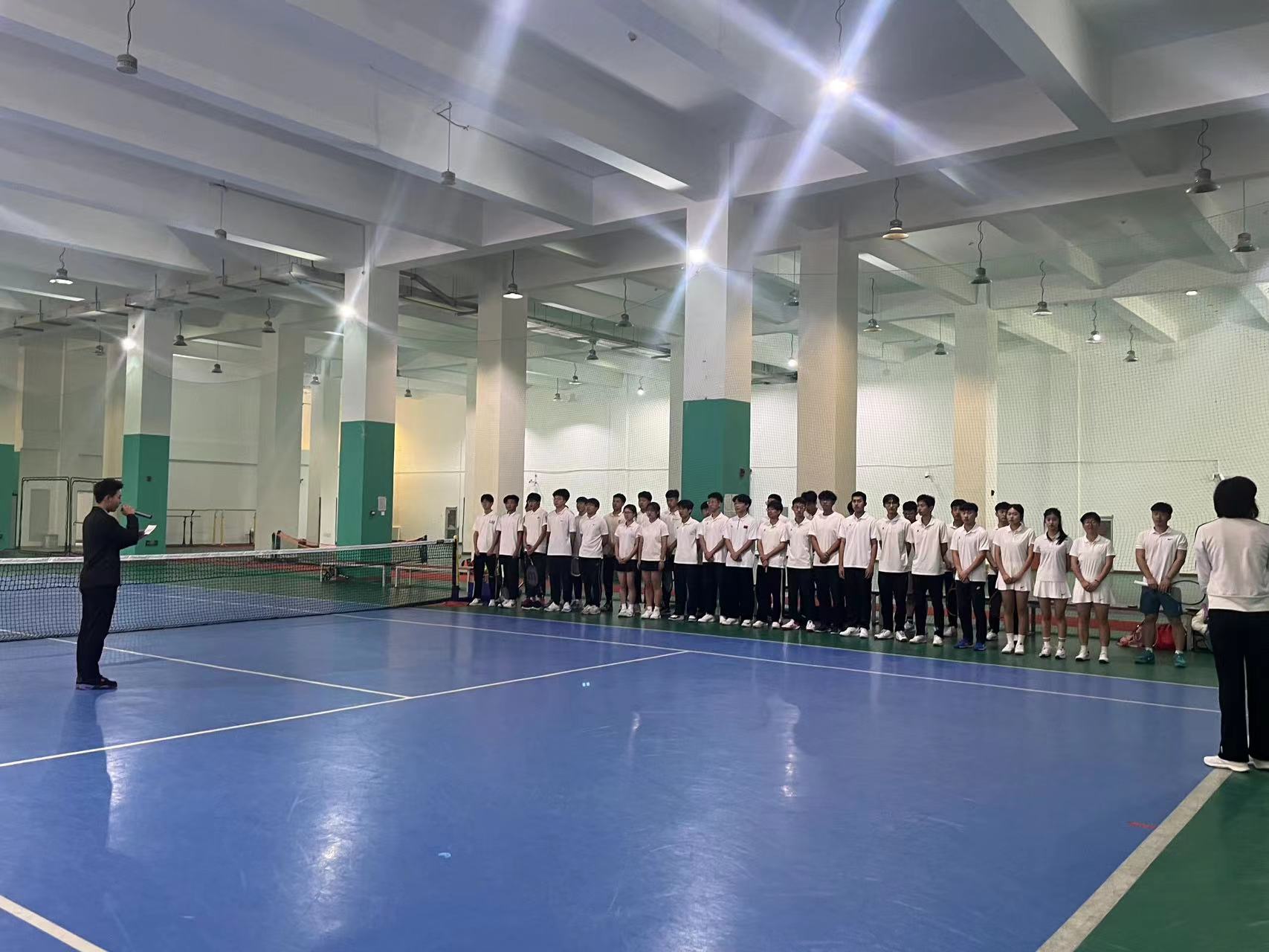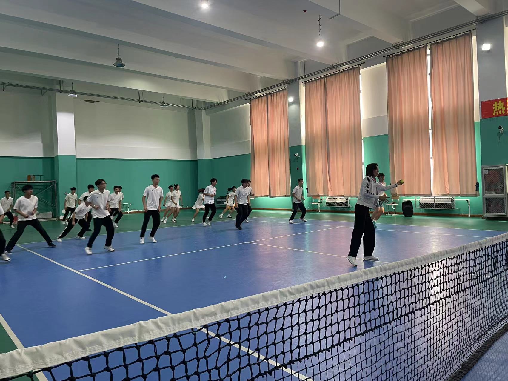 首先,在郑维重教练的组织带领下同学们先进行热身运动,围绕网球馆慢跑、高抬腿,后踢跑等,以及同学们在郑维重教练的指导下分组练习了网球的基本步伐。