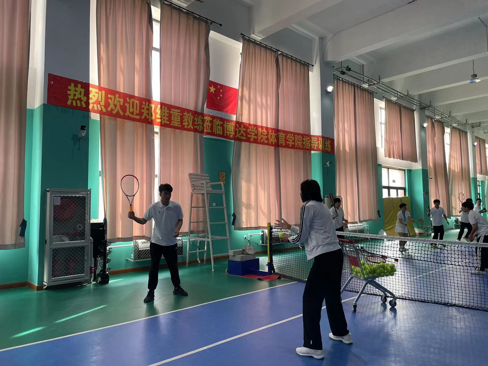 为进一步发挥体教结合的教育教学特色,使学生们得到更好的培养。体育学院于2023年10月18日上午在体育馆一楼网球馆应邀郑维重教练来到我校指导网球训练,参加此次活动的还有刘丹院长,回忆老师以及网球专选的学生们。