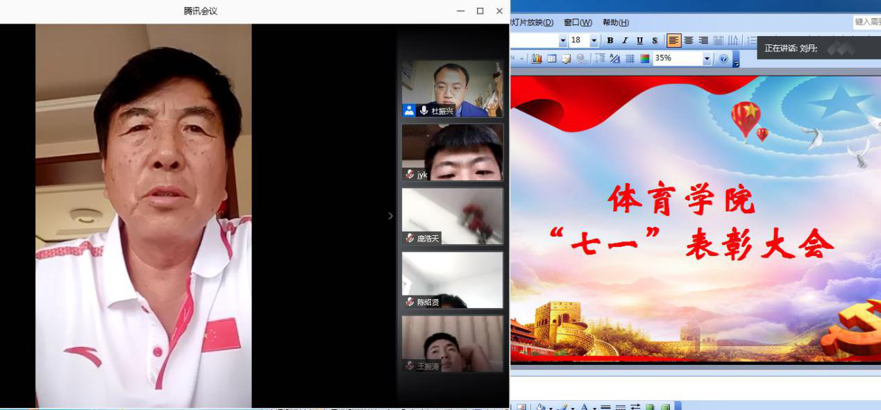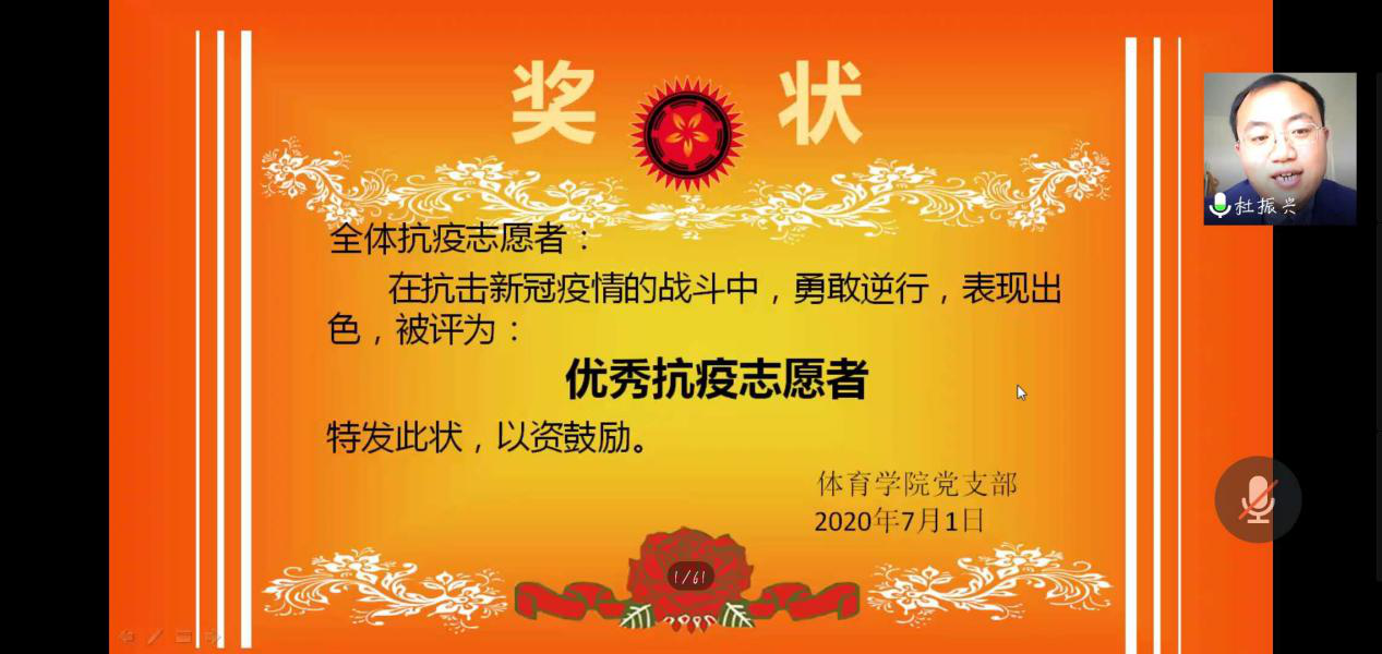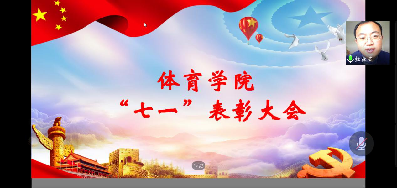 6月27日下午两点,体育学院通过腾讯会议线上召开了庆祝中国共产党成立99周年暨“七一”表彰大会。体育学院院长刘丹、副院长邵连成、副院长田晓丽、副院长陈立春出席本次会议。全院师生,党员,抗疫志愿者参加会议。会议由体育学院党支部书记杜振兴主持。