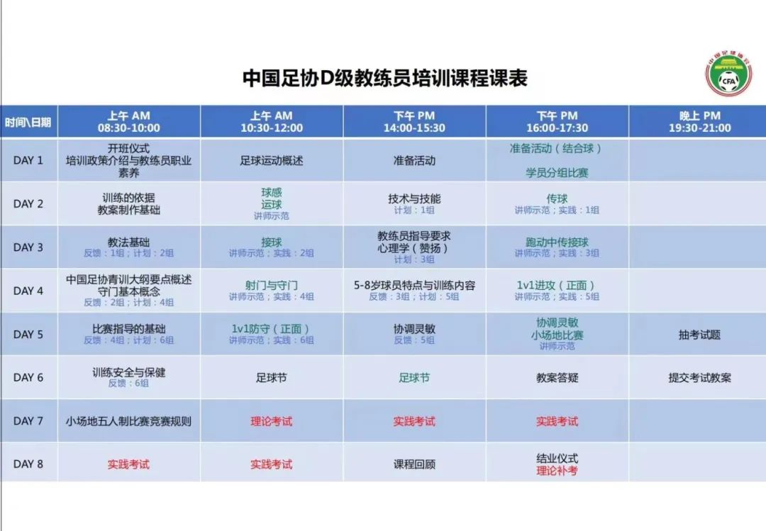 培训班围绕中国足协最新的培训政策展开,学员们在为期八天的培训中,学习了丰富的足球比赛战术、训练原则、防守及进攻的基本要求、指导一场比赛的基本要求、个人作业及小组讨论、小组进攻、定位球的攻防演练等理论课程及实践课程。
