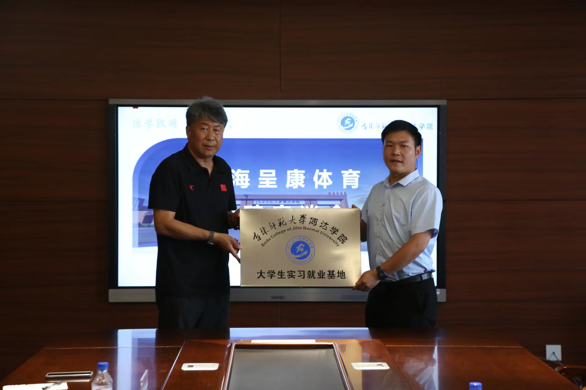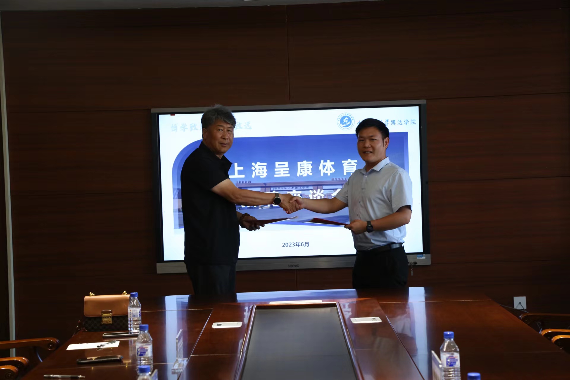 星空游戏中心入口体育学院副院长袁吉和呈康体育校企部经理韩泽上台签约。