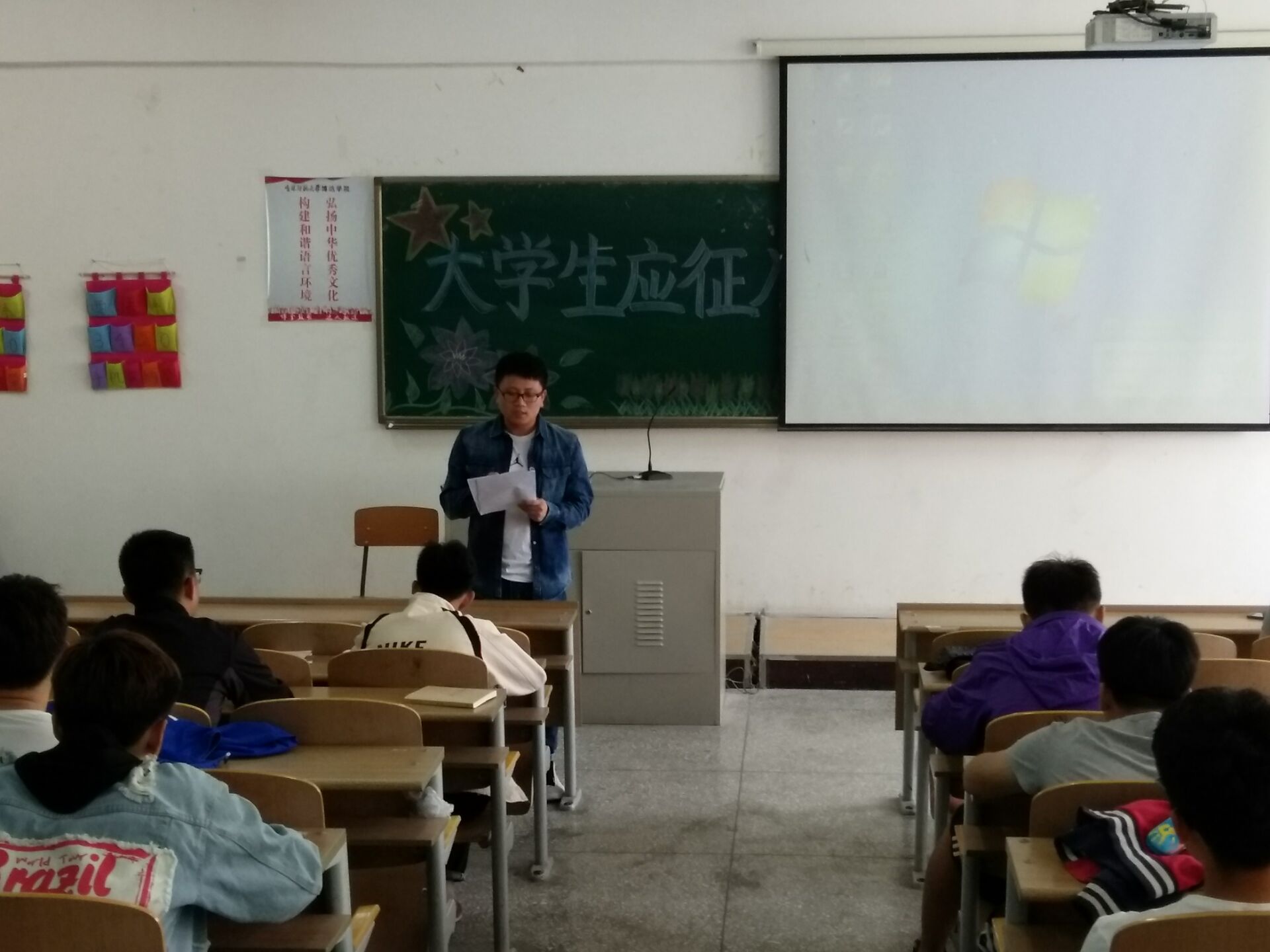为扎实推进大学生兵役登记和预征报名工作顺利进行,2018年5月23日下午两点,体育系在星空游戏中心入口第三教学楼3420教室组织开展了大学生应征入伍宣传活动,体育系辅导员王博老师对应征入伍政策进行了宣讲,15、16、17级全体男生参加了讲座。