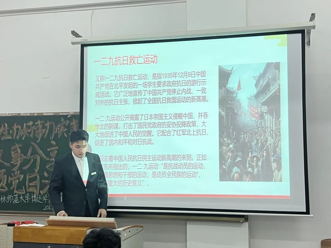 活动开始,学生代表们依次上台,用 PPT 的形式向大家详细介绍了“一二·九”运动的历史背景、过程和意义。他们用生动的语言和丰富的图片,将那个时代的青年学生们为了国家和民族的利益,勇敢地站出来,发起了这场伟大的爱国运动的场景呈现在大家面前。讲解过程中,同学们认真聆听,不时报以热烈的掌声。