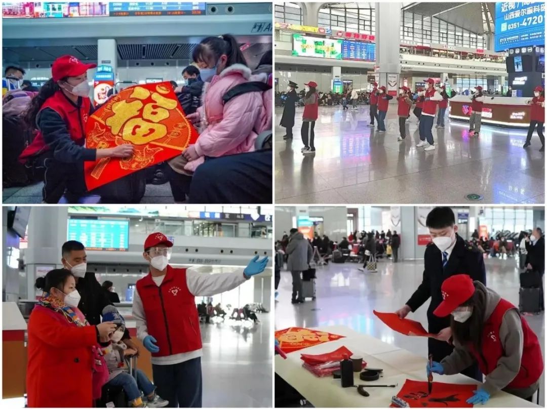 在本次返家乡志愿活动中体育学院2022级张怡同学在 “青春志愿行,温暖回家路”春运志愿服务活动中担任太原站第一批志愿者队长,同铁路职工一起开展春运志愿者四送活动(送祝福、送活力、送春联、送服务),协助旅客平安、温馨、有序出行,让更多的旅客感受到家的温暖。
