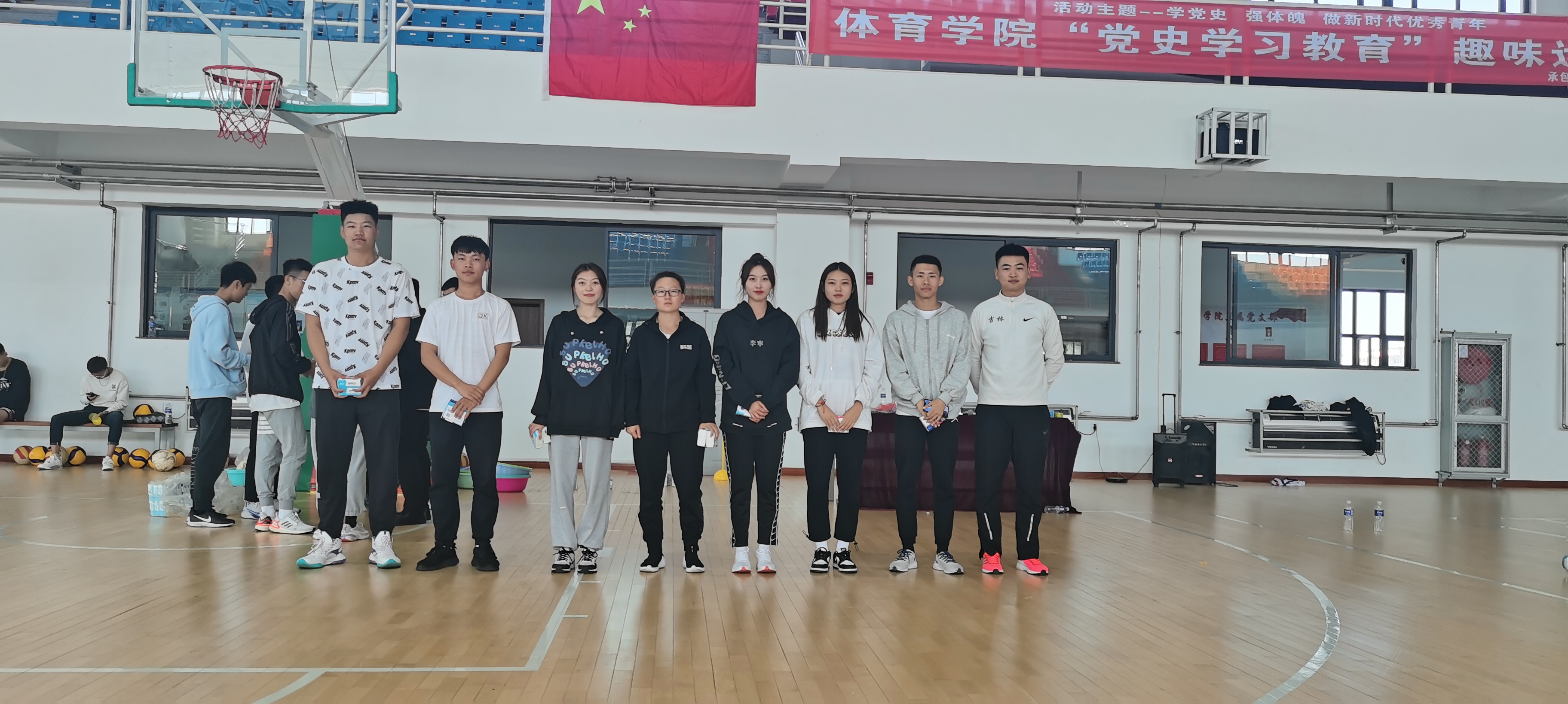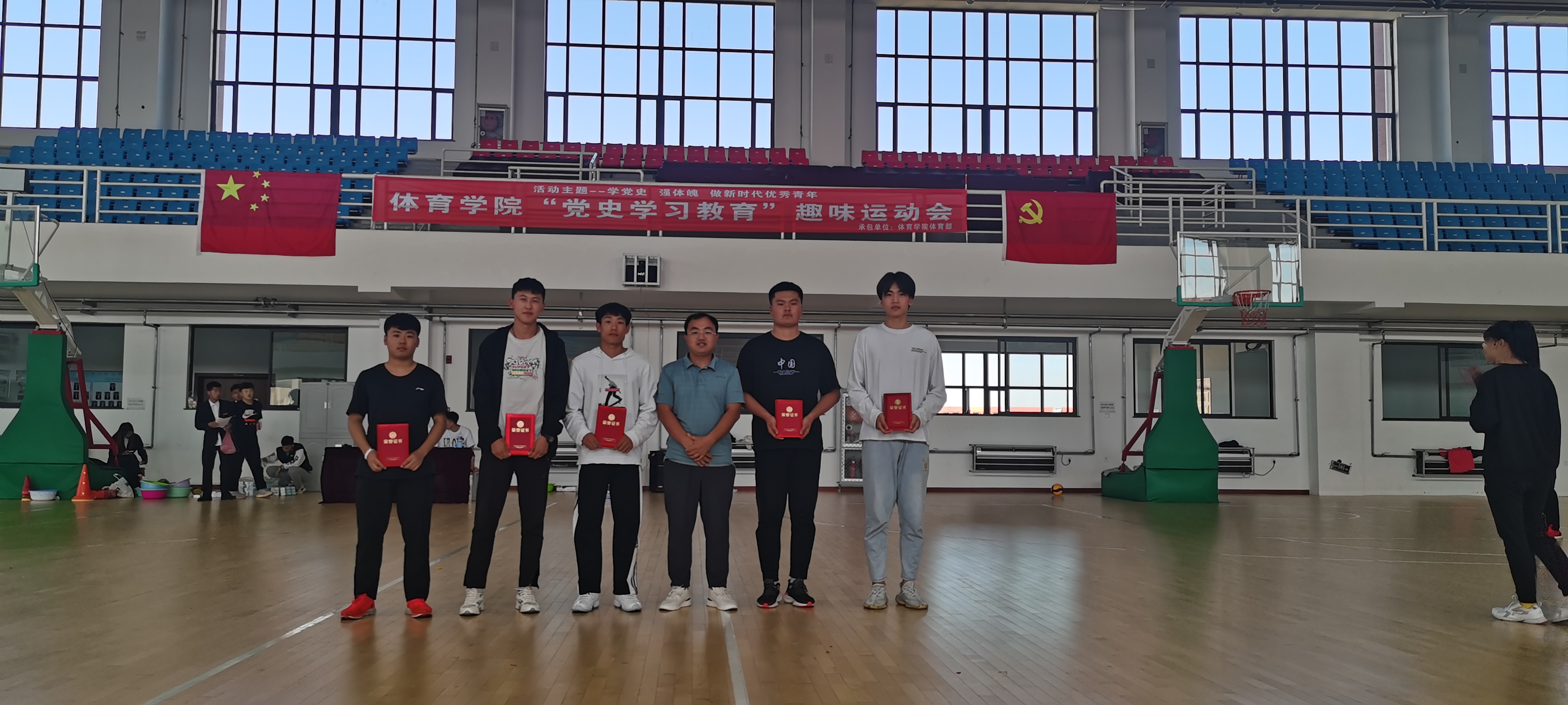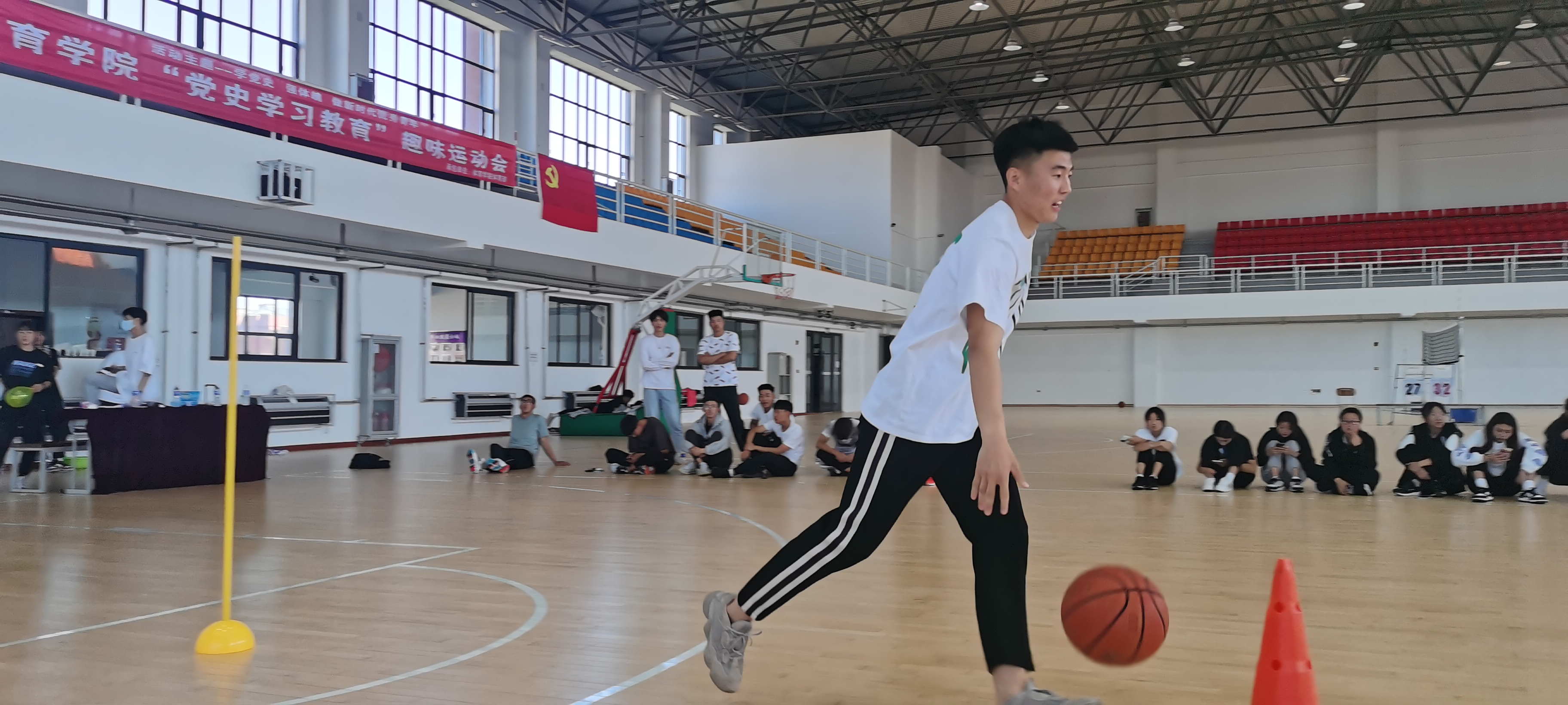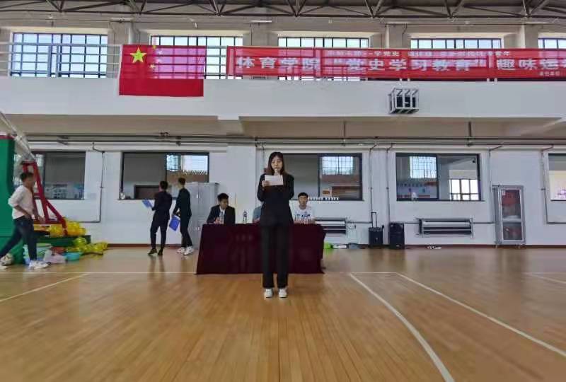今年是中国共产党成立100周年,为了激励2021级新生知党爱党,倡导健康的校园文化生活,培养运动兴趣,树立正确的体育价值观念,建立和谐的学习环境,体育学院于9月18日体育馆篮球场举办了“党史学习教育”趣味运动会。参加此次运动会的人员有杜振兴老师、部分学生干部以及2021级新生。