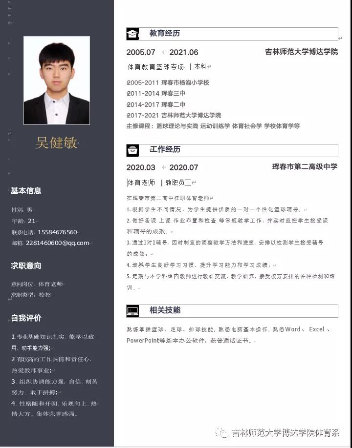 看了这么多优秀的简历,相信同学们经过这次活动,一定对如何制作优美的简历有了自己的心得。最后,希望同学们可以在大学时间提升各种技能,抓住先学习机会,积累实践经验,培养一种成熟的心智。