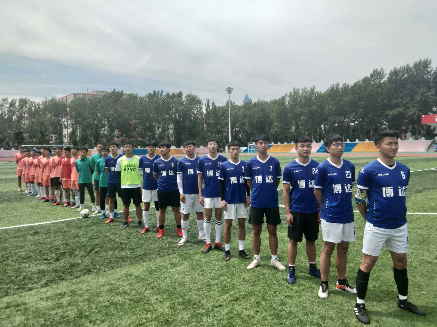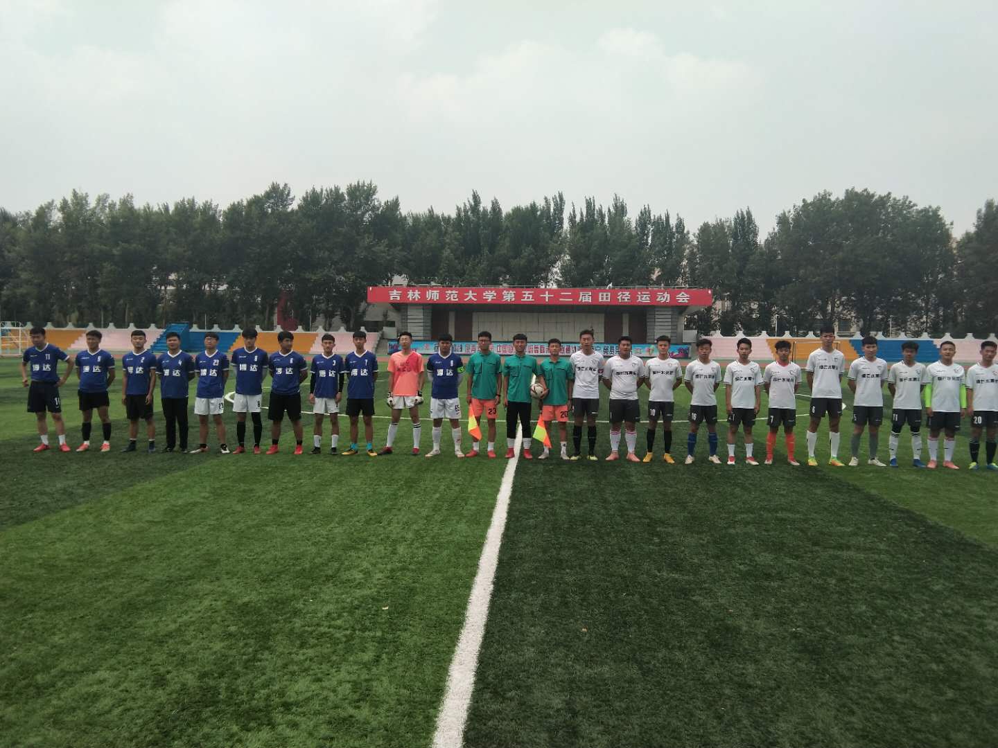 比赛马上要开始了,首先由裁判带领双方队伍进场,双方合影留念,之后,全体队员齐唱国歌。每个队员都十分期待。热身结束结束后,在裁判员的哨令下,双方开始争夺足球,你来我往,竞争激烈。赛场上每个人都竭尽全力,队友倒地全都过来询问情况,体现了足球的友爱精神。随着一声哨响,本次比赛圆满结束。